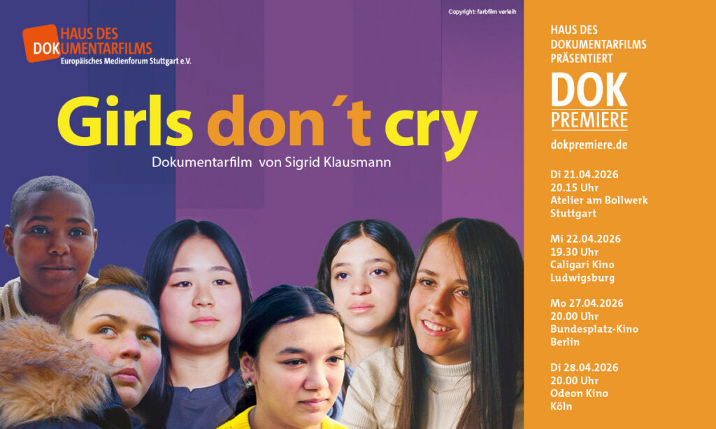 Das Haus des Dokumentarfilms präsentiert als DOK Premiere im April GIRLS DON’T CRY von Sigrid Klausmann in Kooperation mit farbfilm verleih und zusätzlich in Kooperation mit Medien- und Filmgesellschaft BW (MFG) in Stuttgart.